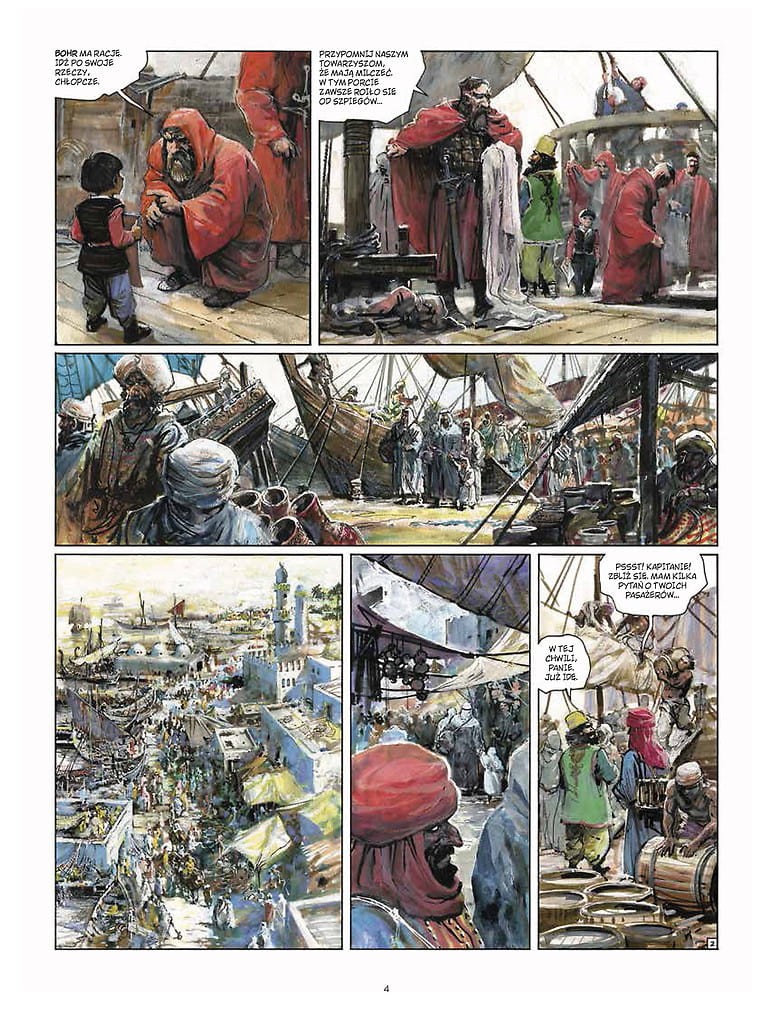 Trzydziesta czwarta część serii fantasy opowiadającej o przygodach Thorgala Aegirssona, szlachetnego wojownika wychowanego pośród wikingów Północy. Thorgal wraz z zaufanym Petrowem oraz młodą Lehlą i ocaloną niewolnicą Salumą dopływają do krańca wschodniego szlaku kupieckiego. Teraz rozciągają się przed nimi pustynie krain Arabów. Właśnie gdzieś tam magowie z tajemniczego Czerwonego Bractwa uprowadzili synka Aegirssona, Aniela. Kiedy wiking dowiaduje się, do czego Aniel jest potrzebny czarownikom, uświadamia sobie, że zostało mu niewiele czasu na ocalenie dziecka. Misja ta okaże się jednak znacznie trudniejsza, niż Thorgal przypuszczał, gdyż jego syn został wciągnięty w skomplikowaną rozgrywkę między Czerwonym Bractwem a kalifem Bag Dadhu i sułtanem łowców niewolników. Seria Thorgal jest obecnie tworzona przez urodzonego w 1964 roku belgijskiego scenarzystę Yves’a Sente’a oraz wybitnego polskiego grafika Grzegorza Rosińskiego, znanego z wielu cykli fantasy i science fiction, takich jak Yans czy Skarga Utraconych Ziem. Wcześniej Sente i Rosiński współpracowali przy miniserii Zemsta hrabiego Skarbka.